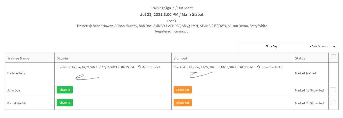 - Here you can mark staff by checking them in and out. This can also be done in real time during the training