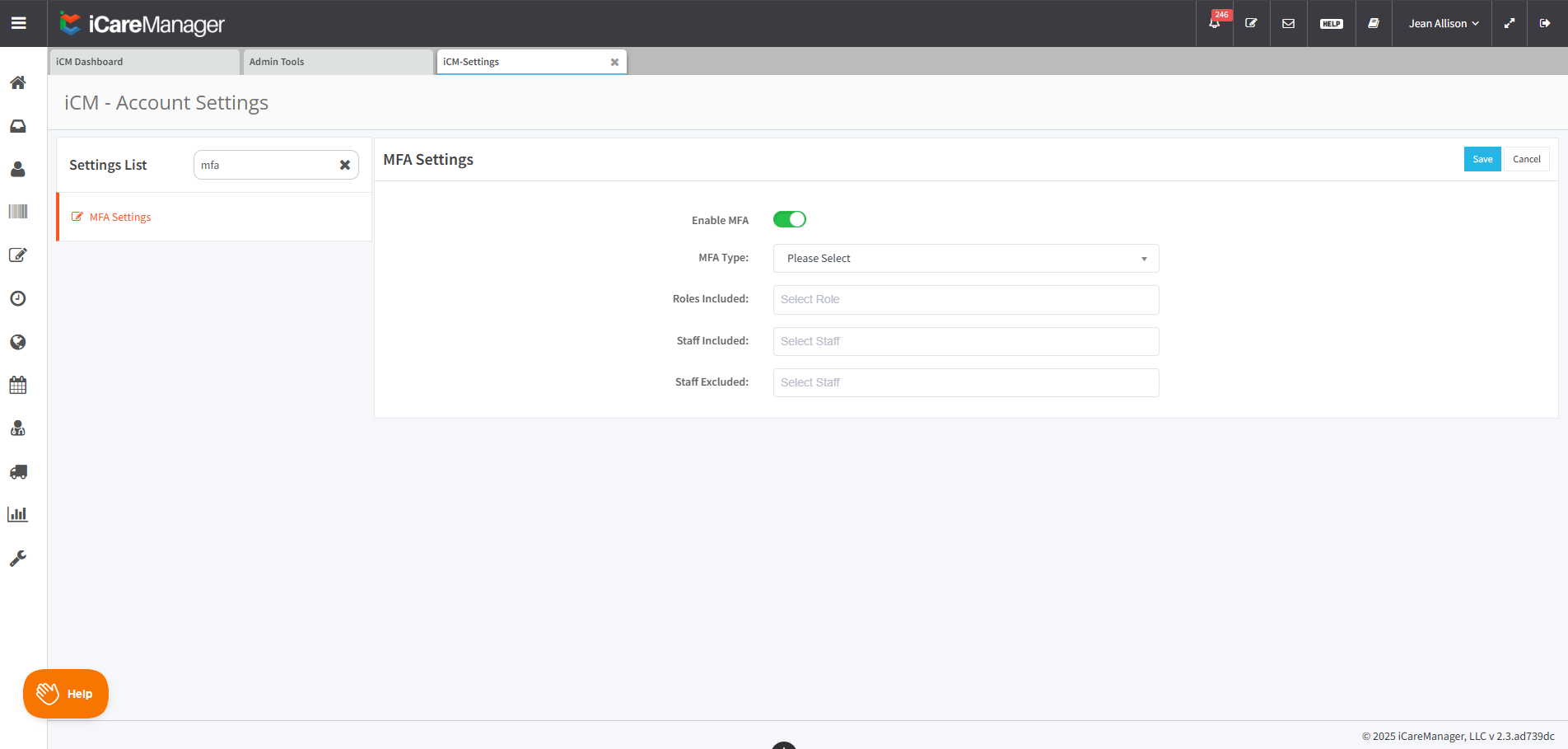 - In iCM, Customer selects Admin Tools-> iCM Account Settings-> MFA Settings