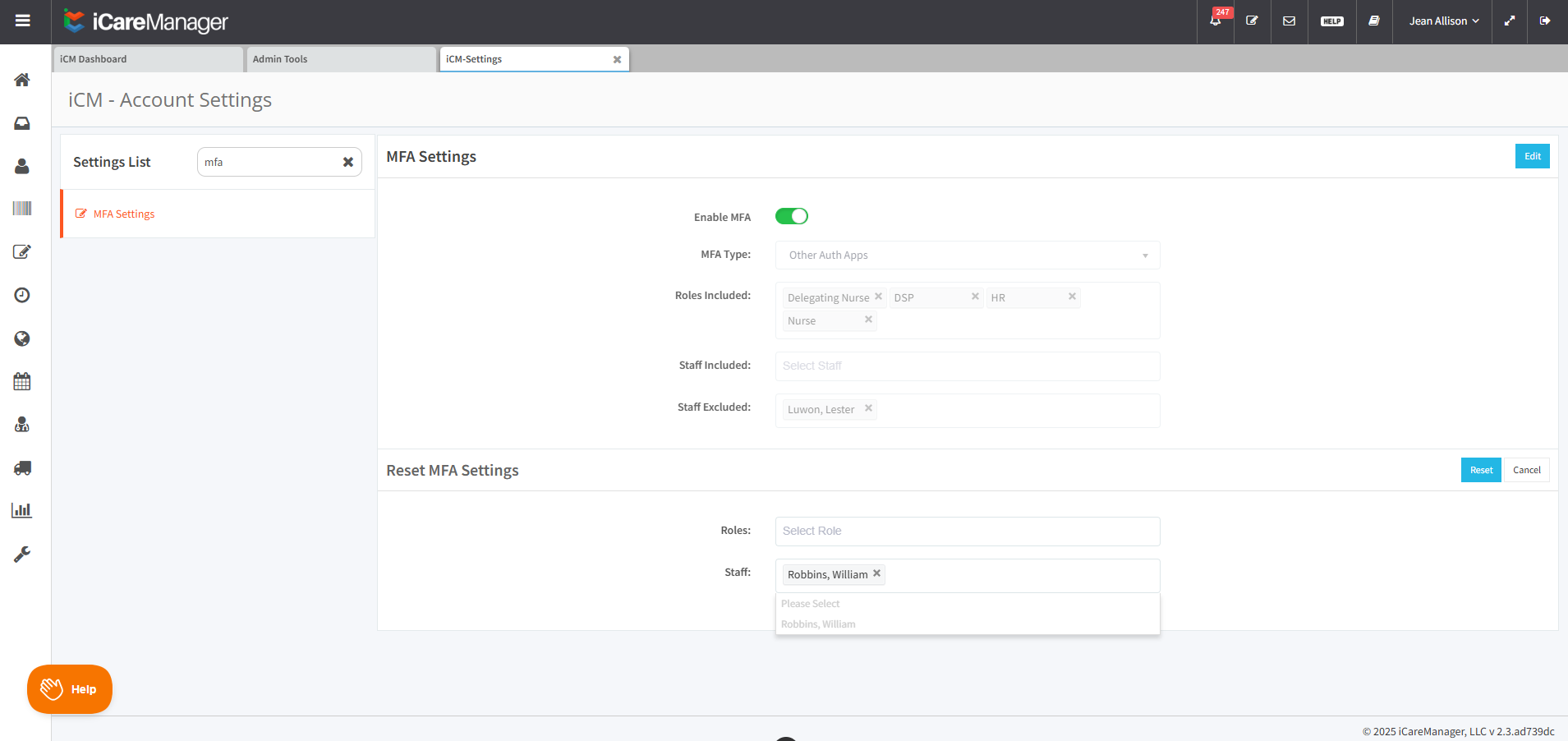 - In iCM, Customer selects Admin Tools-> iCM Account Settings-> MFA Settings and then using the box noted below, Edit and adds the Staff's name to Reset