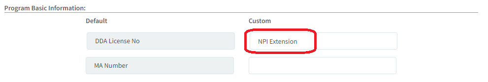 - In iCM-Settings->Label Management, repurpose the Manage Programs field of "DDA License No" and record the custom term of "NPI Extension".