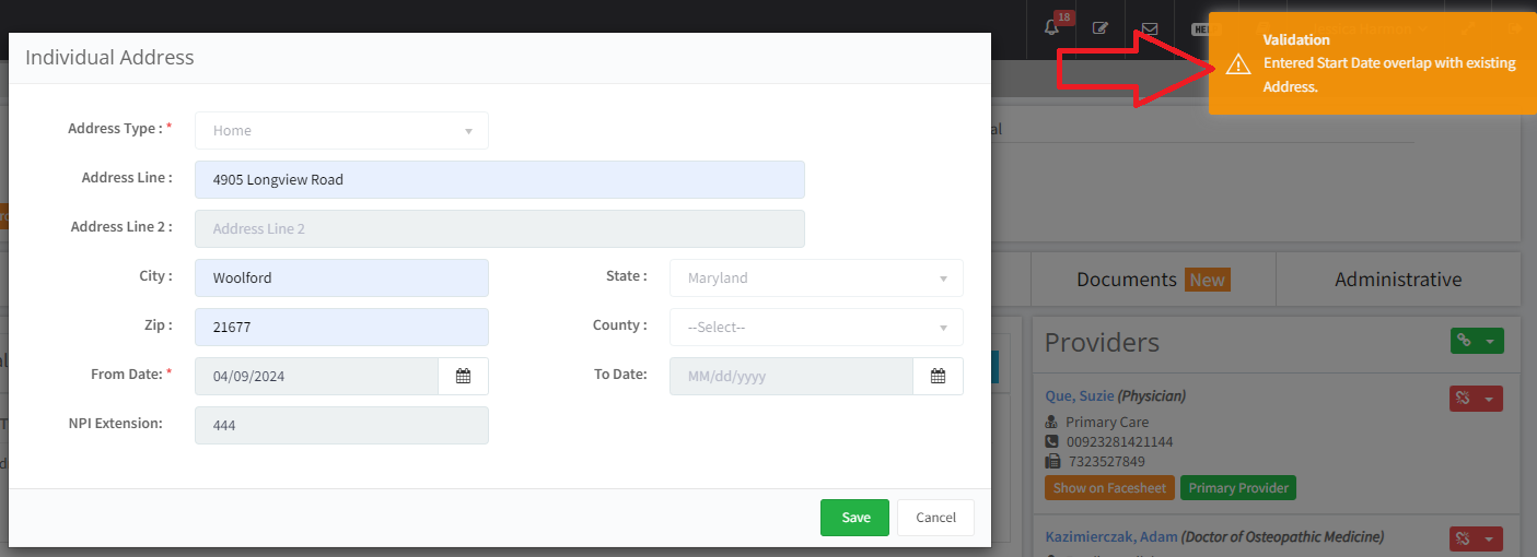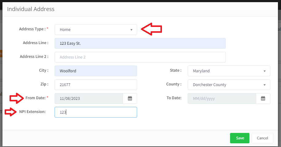 - Select the Address Type: Home and add the "From Date", which is the date the person moved into the location. Then add the NPI Extension and Save.