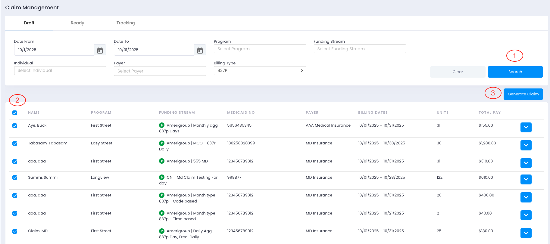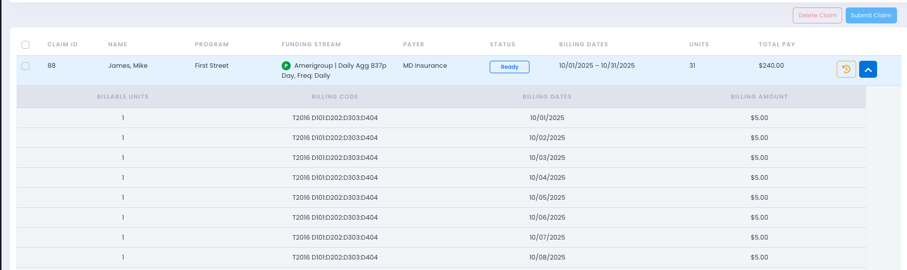 In the Ready tab, users can review generated claims, verify claim details, and validate all underlying attendance logs.