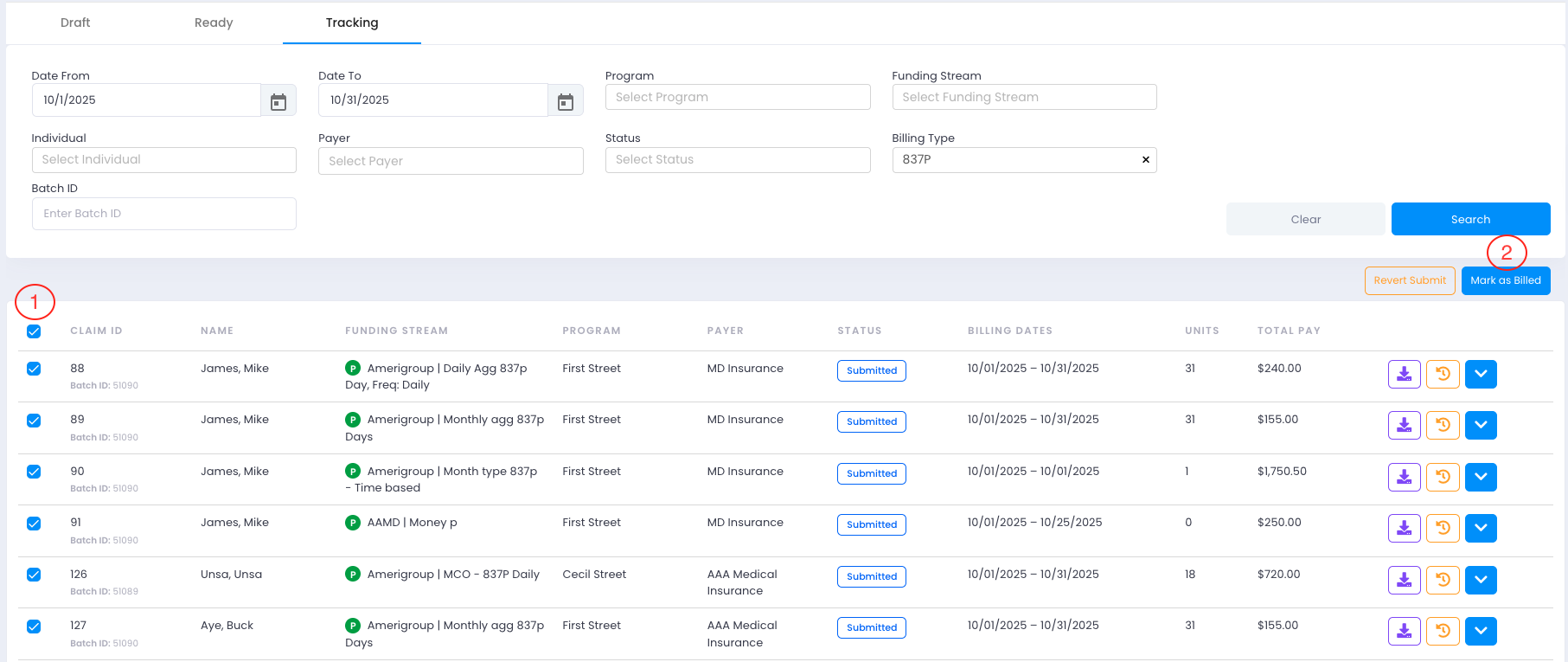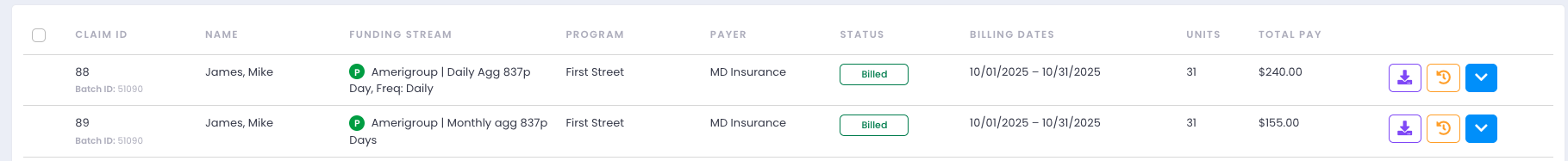 Once reviewed, users select claims and submit them. The system downloads billing files in the required format:Excel or CSV for customized billing workflowsX12 format for Waystar billing