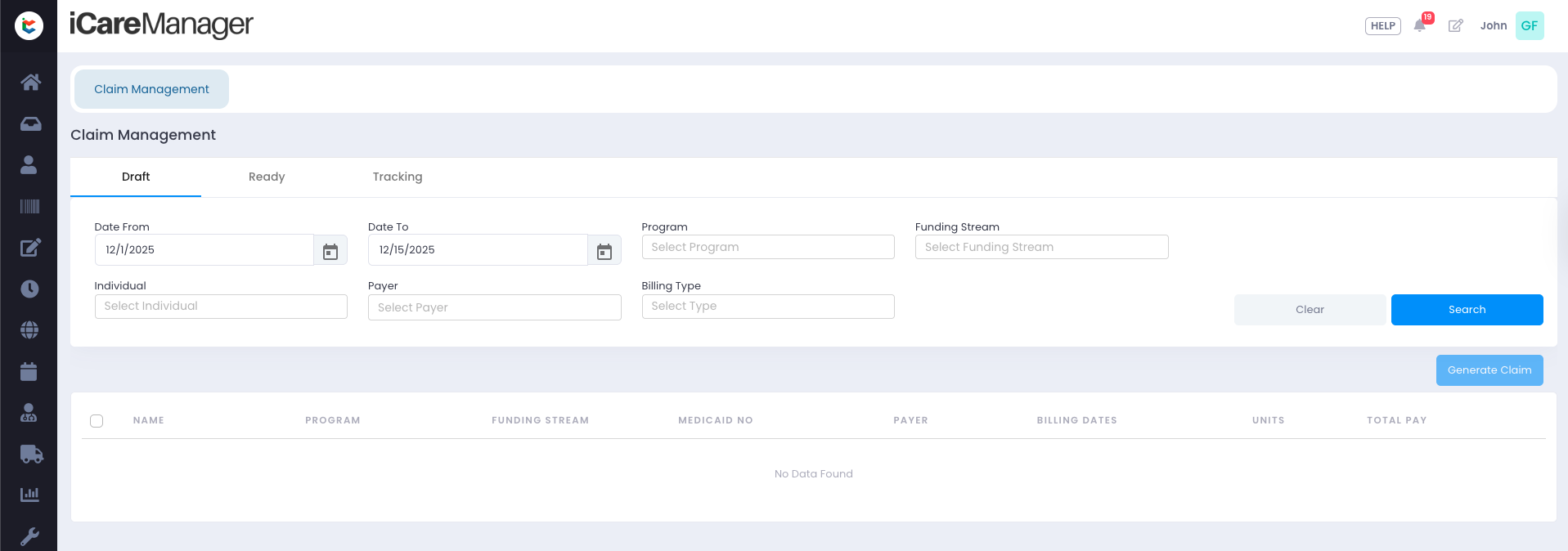 In the Draft tab, users can search for attendance-based claims using filters such as Date Range, Program, Funding Stream, Individual, Payer, and Claim Type.
